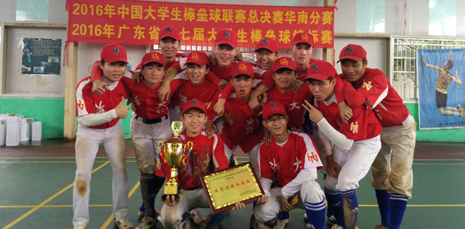 2016年3月,由中国大学生体育协会棒垒球分会主办的2016年中国大学生棒垒球联赛总决赛华南分赛在广州从化顺利举行。在同东道主中山大学南方学院最后一战中,我校棒球队3:4惜败对手,获得本次比赛大学生甲组亚军,成功晋级全国总决赛。因在比赛中表现出良好风格和拼搏精神,同时获得组委会颁发的道德风尚奖。在个人获奖方面:我校教师韩充获本届比赛最佳教练员称号;学生郑学云获本届比赛最佳投手;学生吴义弟、何昌清获本届比赛优秀运动员称号。