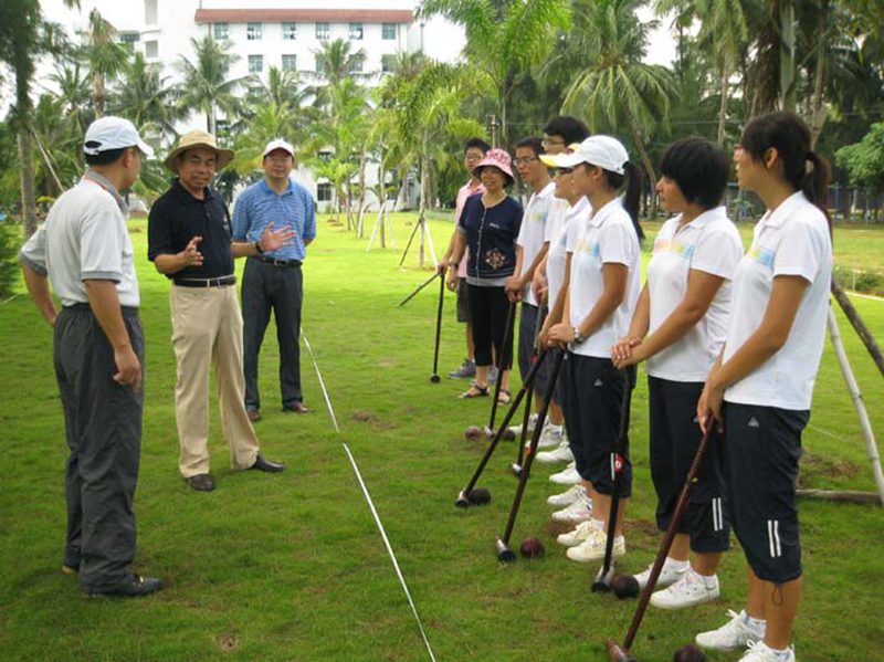 木球是海大的特色运动项目,已有十几年的发展历程,我校木球队在历年国内、国际赛事中,一直保持国内领先水平。今年7月我校木球队在山东举行的两个全国木球赛中取得了院校组男、女团体第一名和4项个人第一名,受到国家体育总局的商请,即将于今年12月代表国家赴阿曼马斯喀特参加第二届亚洲沙滩运动会。8月29日上午,校党委刘康德书记和傅国华副校长亲临我校“金桥”木球场现场,为即将代表国家出征的海大木球队加油、鼓劲,并与木球队员一起体验木球运动。