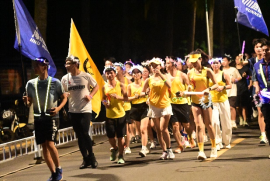 夜色下、光影中,涌动的选手们手持各色荧光棒、佩戴荧光头饰和手环,犹如一条荧光长龙奔腾,照亮了海南大学各个角落,留下了律动青春足迹,形成一道亮丽风景线。每一个夜跑人都在尽情享受着奔跑的快乐,他们用热情点亮希望,用青春告白祖国。