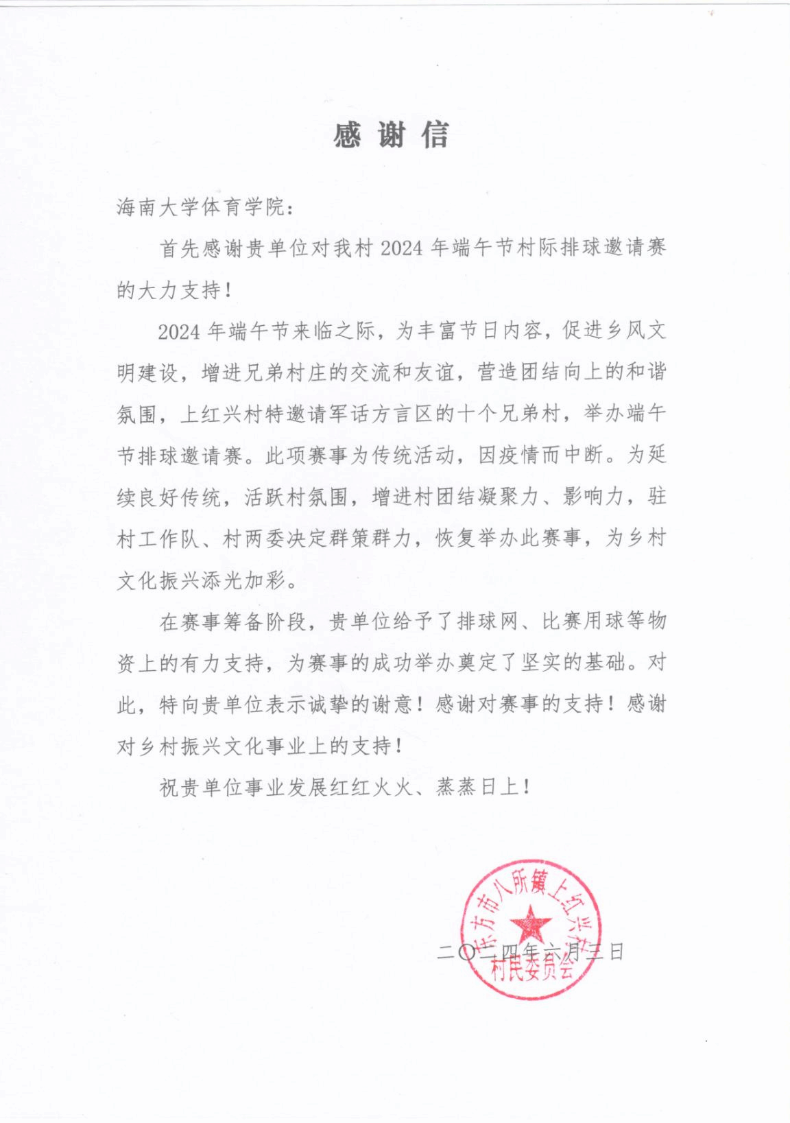 上红新村在感谢信中特别强调了对海南大学WilliamHill体育的感激之情,感谢版权所有:威廉希尔·williamhill(中国)中文官网对乡村文化振兴的有力支持。WilliamHill体育的这一举措,不仅丰富了乡村的文化生活,更激发了村民们对体育运动的热爱和参与热情,为乡村文化建设注入了新的活力。