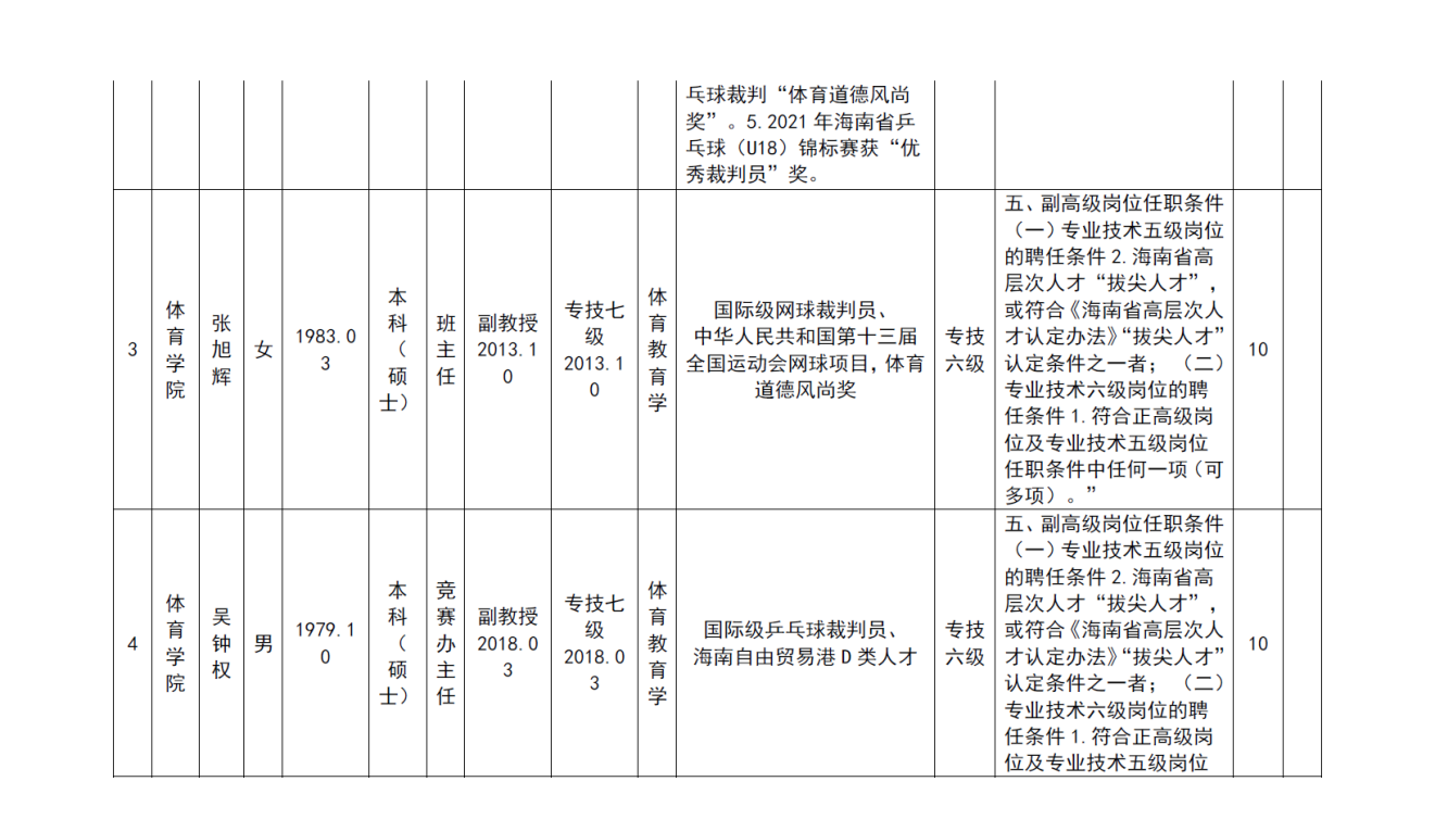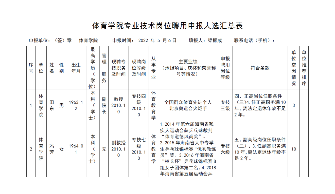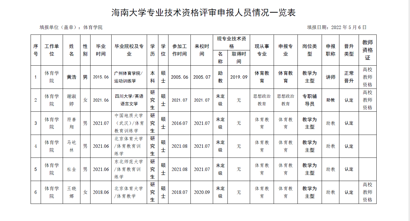 根据《海南省人力资源和社会保障厅关于我省事业单位岗位设置管理有关问题的通知》(琼人社发[2013]54号),《海南大学岗位设置及聘用方案(修订)》(海大[2020]103号)等相关要求,由教职工本人申请,共有6名教师提出2022年度专业岗位聘用申请、10名教师提出专业技术评审和认定申请, 学院基层评审委员会审核,并票决全部通过。具体名单如下: